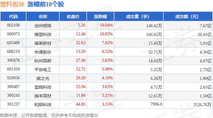 证券之星音讯,11月13日塑料板块较上一交易日上涨1.77%,沧州明珠领涨。当日上证指数报收于4029.5,上涨0.73%。深证成指报收于13476.52,上涨1.78%。塑料板块个股涨跌见下表: