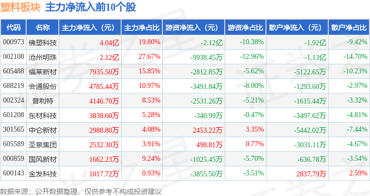 从资金流向上来看,当日塑料板块主力资金净流入4.33亿元,游资资金净流出3.57亿元,散户资金净流出7586.34万元。塑料板块个股资金流向见下表: