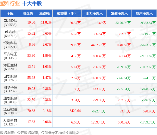 个股体现方面,塑料职业当日领涨股为同益股份(300538),该股当日报收19.3,上涨11.82%,成交量50.37万,主力资金净流入1.46亿元。唯赛勃(688718)以上涨3.6%紧随其后,该股当日成交量5.62万,主力资金净流入386.84万元。除此之外,银禧科技(300221)、安全电工(001359)、海正生材(688203)均进入当日牛股之列。具体个股列表见下表: